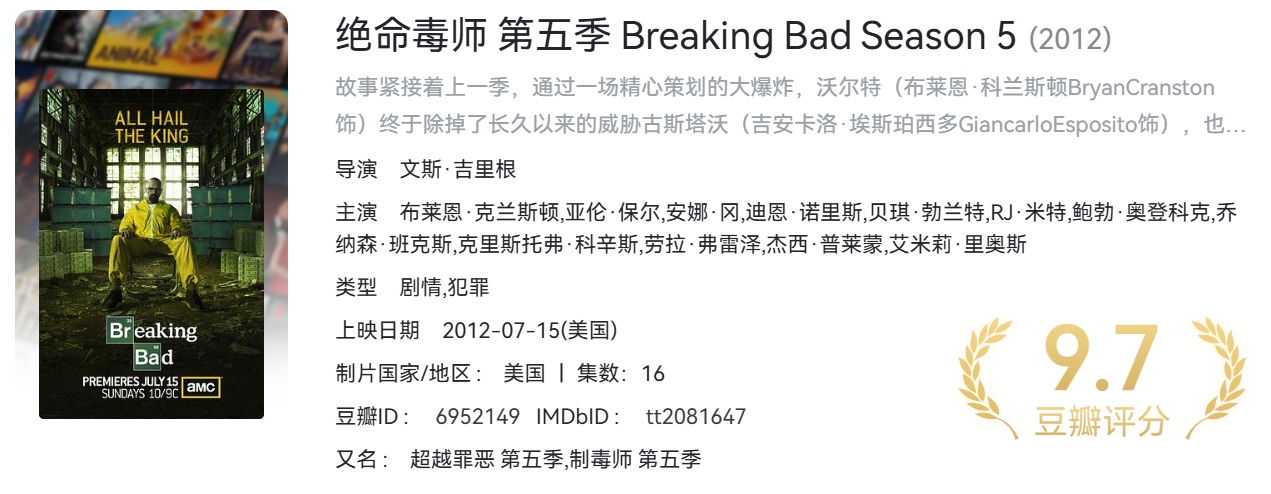 洗版收藏《绝命毒师》S01-S05.全五季 [4K 蓝光收藏版] [内封中英.简中字幕][214.28GB] 栏目:剧集区 作者:零距 时间:2025-01-23 10:59:24   **剧情简介:** 通过一场精心策划的大爆炸,沃尔特终于除掉了长久以来的威胁古斯塔沃,也将古斯塔沃一手建立的毒品帝国连根拔起。然而,“事业”上的成功并没有为沃尔特带来太多的快乐,因为他和妻子斯凯勒之间的关系再次跌落到了冰点。古斯塔沃死了,但沃尔特的野心并没有消失,他联手杰西与麦克,开始建立属于他的新的帝国。一次偶然中,汉克在沃尔特家中发现了沃尔特就是海森堡的确凿证据,巨大的打击之下,他决心大义灭亲,昔日的连襟,如今沦为对手。与此同时,一股新的势力正在毒品圈内逐渐壮大,他们即将成为汉克最强大的敌人... > [!success] **资源链接** > [https://pan.quark.cn/s/4f42db813eab](https://pan.quark.cn/s/4f42db813eab "https://pan.quark.cn/s/4f42db813eab") 版权声明:本站不存储任何实质资源,该帖为发布的网盘链接介绍帖。如您认为本站任何介绍帖侵犯了您的合法版权,请联系站长 ( 微信:lizzylxh ) 进行投诉,我们将在确认本文链接指向的资源存在侵权后,立即删除相关介绍帖子!