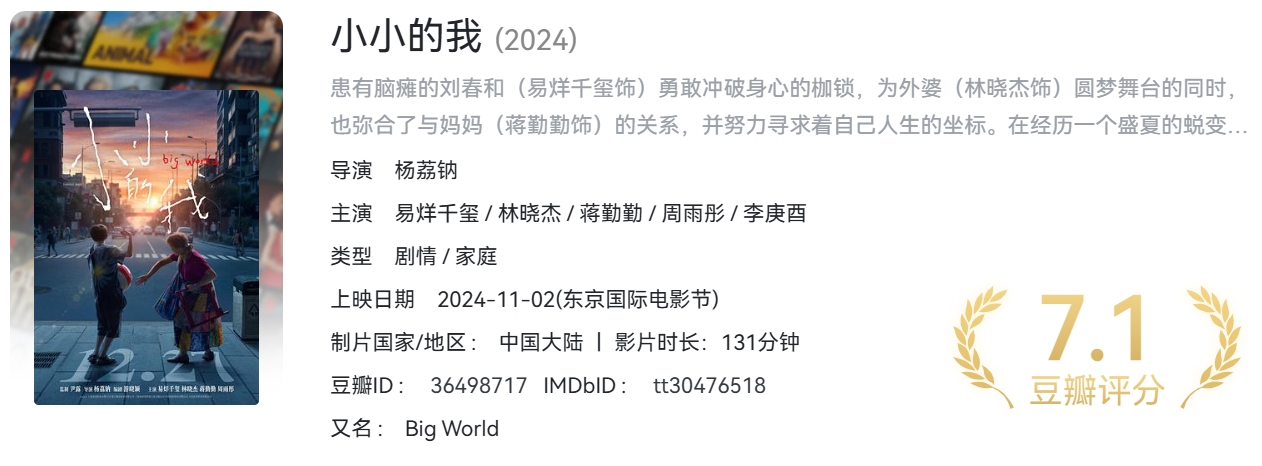 小小的我(2024)正式版 易烊千玺【4K HQ 高码率 60帧率版】【DTS5.1环绕声】国语中字【24.2G】 栏目:电影区 作者:零距 时间:2025-02-05 09:58:04   **剧情简介:** 患有脑瘫的刘春和(易烊千玺饰)勇敢冲破身心的枷锁,为外婆(林晓杰饰)圆梦舞台的同时,也弥合了与妈妈(蒋勤勤饰)的关系,并努力寻求着自己人生的坐标。在经历一个盛夏的蜕变后,他终于踏上了新的旅程。 > [!success] **资源链接** > [https://pan.quark.cn/s/1adb6e40d0a9](https://pan.quark.cn/s/1adb6e40d0a9 "https://pan.quark.cn/s/1adb6e40d0a9") 版权声明:本站不存储任何实质资源,该帖为发布的网盘链接介绍帖。如您认为本站任何介绍帖侵犯了您的合法版权,请联系站长 ( 微信:lizzylxh ) 进行投诉,我们将在确认本文链接指向的资源存在侵权后,立即删除相关介绍帖子!