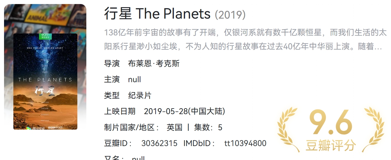 豆瓣 9.6 纪录片《行星》 (2019)讲述宇宙的故事 1080p 内封中英双字 共 2.86G 栏目:纪录片 作者:零距 时间:2025-03-14 09:32:17   **简介:** 138亿年前宇宙的故事有了开端,仅银河系就有数千亿颗恒星,而我们生活的太阳系行星渺小如尘埃,不为人知的行星故事在过去40亿年中华丽上演。随着人类观测技术的不断进步,宇宙飞船带领我们探索各个行星,此部纪录片用独特的拟人化手法解构八大行星的故事,并结合最先进的科技视觉化呈现。 > [!success] **资源链接** > [https://pan.quark.cn/s/69c0595a94fd](https://pan.quark.cn/s/69c0595a94fd "https://pan.quark.cn/s/69c0595a94fd") 版权声明:本站不存储任何实质资源,该帖为发布的网盘链接介绍帖。如您认为本站任何介绍帖侵犯了您的合法版权,请联系站长 ( 微信:lizzylxh ) 进行投诉,我们将在确认本文链接指向的资源存在侵权后,立即删除相关介绍帖子!