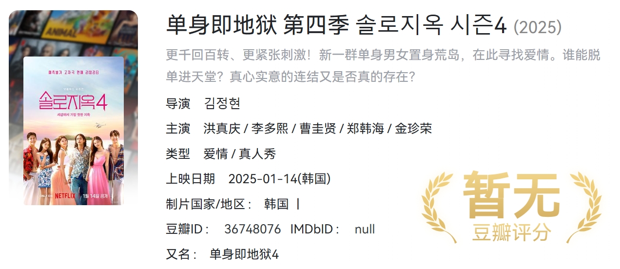 【2025韩综】《单身即地狱 第四季》 【同步更新】【附1-3季】[韩国]【1080P】【77.2G】【官中字幕】 栏目:综艺区 作者:零距 时间:2025-06-10 17:18:14   **简介:** 俊男靓女被困“地狱岛”,逃离方法只有一个:每晚与某人成为情侣。配对成功的人当晚可搬去“天堂岛”,享受优质食物和住宿,而未找到伴的人,晚上得在“地狱岛”自力更生 > [!success] **资源链接** > [https://pan.quark.cn/s/da1b74919f23](https://pan.quark.cn/s/da1b74919f23 "https://pan.quark.cn/s/da1b74919f23") 版权声明:本站不存储任何实质资源,该帖为发布的网盘链接介绍帖。如您认为本站任何介绍帖侵犯了您的合法版权,请联系站长 ( 微信:lizzylxh ) 进行投诉,我们将在确认本文链接指向的资源存在侵权后,立即删除相关介绍帖子!