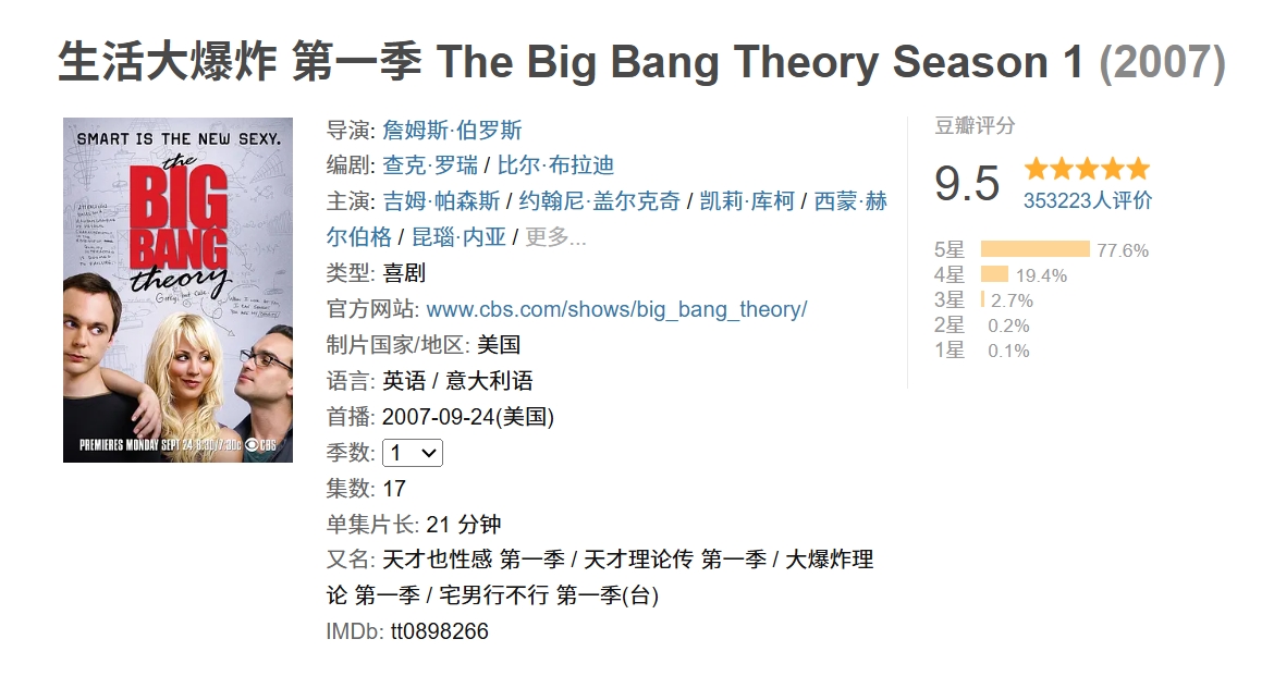 经典高分喜剧《生活大爆炸》1-12季 1080P蓝光 内嵌中英字幕 高清无水印收藏版 栏目:剧集区 作者:零距 时间:2025-01-10 16:14:25    **导演:**詹姆斯·伯罗斯 **编剧:**查克·罗瑞 / 比尔·布拉迪 **主演:**吉姆·帕森斯 / 约翰尼·盖尔克奇 / 更多... **类型:**喜剧 **制片国家/地区:**美国 **语言:**英语 / 意大利语 **首播:**2007-09-24(美国) **集数:**17 **单集片长:**21 分钟 **剧情简介:**Leonard 和 Sheldon是一对合起来智商超过360的疯狂科学家宅男。他们的科学家朋友还有风流的 Wolowitz 和从来不和女人说话的印度人。最近,科学家宅男的对门搬来一个超好看的女剧作家兼餐厅招待 Penny。宅男开始蠢蠢欲动了,于是诸多啼笑皆非的故事在几个朋友间“爆炸”开来。 > [!success] **资源链接** > [https://pan.quark.cn/s/87eb2410f299](https://pan.quark.cn/s/87eb2410f299 "https://pan.quark.cn/s/87eb2410f299") 版权声明:本站不存储任何实质资源,该帖为发布的网盘链接介绍帖。如您认为本站任何介绍帖侵犯了您的合法版权,请联系站长 ( 微信:lizzylxh ) 进行投诉,我们将在确认本文链接指向的资源存在侵权后,立即删除相关介绍帖子!