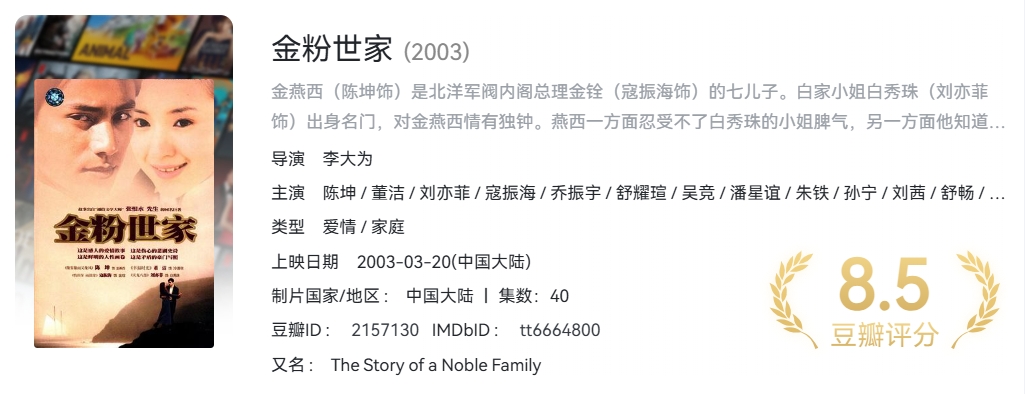 豆瓣8.5高分. 陈坤/董洁/刘亦菲经典爱情剧《金粉世家》(2003)全40集.1080P国语中字【56.7G】 栏目:剧集区 作者:零距 时间:2025-01-02 09:06:22    **简介:** 金燕西(陈坤饰)是北洋军阀内阁总理金铨(寇振海饰)的七儿子。白家小姐白秀珠(刘亦菲饰)出身名门,对金燕西情有独钟。燕西一方面忍受不了白秀珠的小姐脾气,另一方面他知道金家与白家都有激烈的权力冲突,所以对白秀珠爱理不理。直到他偶遇了出身寒微的女学生冷清秋(董洁饰),燕西对清秋一见钟情,继而展开了激烈的追求。自由恋爱的新思潮跟封建传统观念产生了冲突,克服了一切困难后,燕西还是跟清秋结婚了。白秀珠深感不甘,一场三角情感的纠缠就此开始。婚后的清秋深觉嫁入豪门的不易,钩心斗角的事情让本来单纯的她倍感压力,与丈夫的处事方式也有了很大的分歧。最后面对燕西的出轨,清秋心灰意冷…… > [!success] **资源链接** > [https://pan.quark.cn/s/5f796168f772](https://pan.quark.cn/s/5f796168f772 "https://pan.quark.cn/s/5f796168f772") 版权声明:本站不存储任何实质资源,该帖为发布的网盘链接介绍帖。如您认为本站任何介绍帖侵犯了您的合法版权,请联系站长 ( 微信:lizzylxh ) 进行投诉,我们将在确认本文链接指向的资源存在侵权后,立即删除相关介绍帖子!
