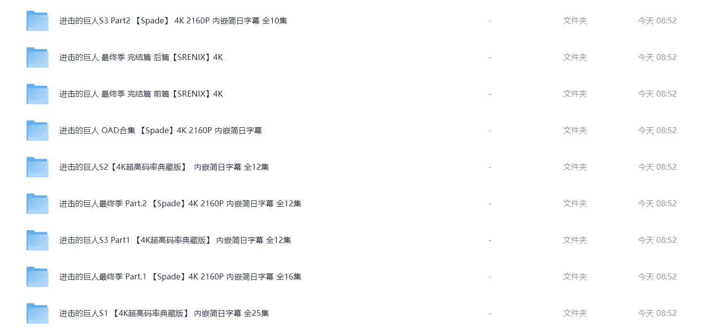 《进击的巨人》全系列完结【顶级4K典藏版】 4K超高码率 单集8G 附OVA合集 【内嵌简日双语特效字幕】 814G 栏目:动漫区 作者:零距 时间:2025-01-03 08:56:26    **简介:** 《进击的巨人》(日语:進撃の巨人)是一部日本的黑暗奇幻动画连续剧,改编自漫画家谏山创的同名漫画。 故事发生在虚构世界,人们生活在由三道层层包围的巨大围墙所构成的世界中,围墙外面有着无数以人类为食的巨人。故事围绕着主人公艾伦·耶格尔和他的朋友三笠·阿克曼以及阿尔敏·阿诺德的经历展开。三人原本平静的生活因某日巨人破墙而入而随之改变,之后经历苦难的他们加入了专门对付墙外巨人的调查兵团。艾伦和他的朋友们发誓要将这世界上的巨人赶尽杀绝,并在之后的历练中成长为与巨人作战的精锐士兵。然而随着艾伦被发现也是巨人之一后,这个世界背后的真相被一点点揭开。故事的主题也由最初的热血复仇逐渐变成对世间的人性和正义的复杂解读。 本作在剧情、作画与配乐各方面出色的表现,使其在日本国内与海外的众多影视评论网站上获得接近满分的评价,**被认为是近年日本动画的代表作之一**。 > [!success] **资源链接** > [https://pan.quark.cn/s/979f716b3125](https://pan.quark.cn/s/979f716b3125 "https://pan.quark.cn/s/979f716b3125") 版权声明:本站不存储任何实质资源,该帖为发布的网盘链接介绍帖。如您认为本站任何介绍帖侵犯了您的合法版权,请联系站长 ( 微信:lizzylxh ) 进行投诉,我们将在确认本文链接指向的资源存在侵权后,立即删除相关介绍帖子!