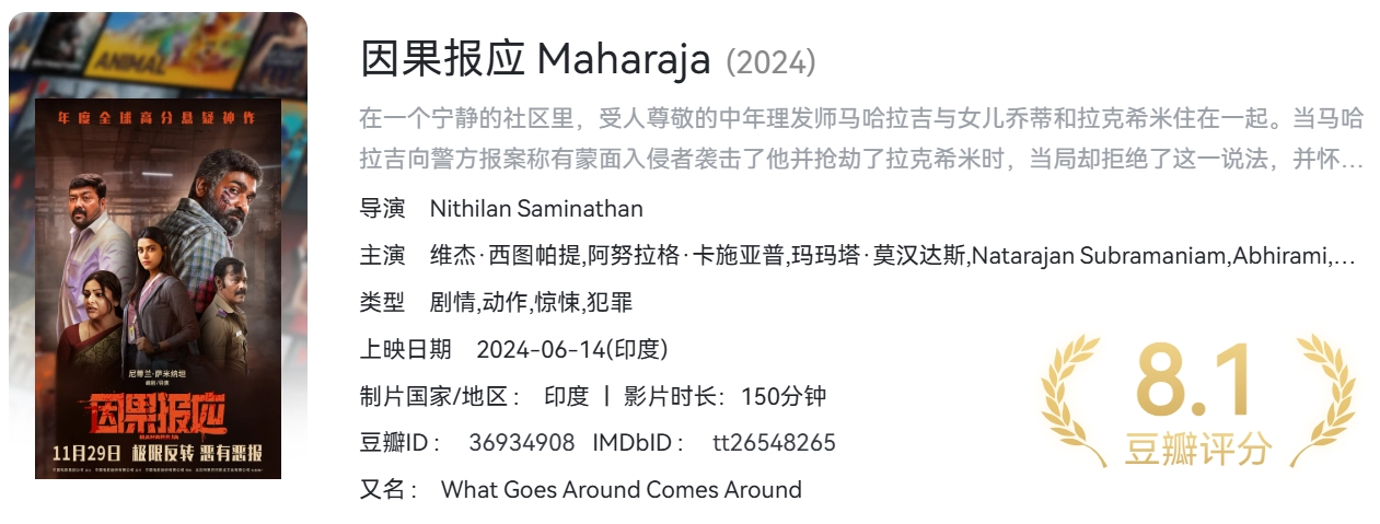 因果报应(2024)【NF / 4K / SDR / 高码率】【杜比5.1音效】【简英特效字幕】【印度高分电影】【16.4G】 栏目:电影区 作者:零距 时间:2025-01-04 08:41:01    **简介:** 在一个宁静的社区里,受人尊敬的中年理发师马哈拉吉与女儿乔蒂和拉克希米住在一起。当马哈拉吉向警方报案称有蒙面入侵者袭击了他并抢劫了拉克希米时,当局却拒绝了这一说法,并怀疑她所失财物的真实性。尽管他多次试图寻求帮助,但他还是不惜一切代价,甚至在女儿回来之前亲自调查。随着疑点越来越多,大君的理智受到质疑,谜团也越来越深。 > [!success] **资源链接** > [https://pan.quark.cn/s/b4f3ed9e1c5c](https://pan.quark.cn/s/b4f3ed9e1c5c "https://pan.quark.cn/s/b4f3ed9e1c5c") 版权声明:本站不存储任何实质资源,该帖为发布的网盘链接介绍帖。如您认为本站任何介绍帖侵犯了您的合法版权,请联系站长 ( 微信:lizzylxh ) 进行投诉,我们将在确认本文链接指向的资源存在侵权后,立即删除相关介绍帖子!